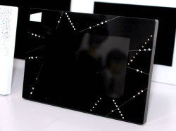 そして本機ではスワロフスキー装飾モデルの「DPF-D720 WI」と「DPF-D720 BU」も用意。ホワイトの「WI」では背景にボタニカルパターンをプリントして大小のスワロフスキーエレメントを散りばめ、草花に朝露が光輝いているような情景をイメージ。ブラックの「BU」では背景にメタルラインを何本もクロスさせ、その上をスワロフスキーエレメントがランダムに連なるデザインで、宇宙空間の流星群のようなイメージに仕上げている。