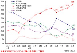 そのほかの高付加価値もテレビの状況をみると、液晶テレビではLEDバックライト搭載モデルが9月で42.6%を占めており年内にはCCFLタイプを凌駕する勢いだという。一方、3Dテレビは、メガネなど別売りの「レディ機」も含めて薄型テレビの2.5%と、こちらはまだこれからといった状況だとしている。