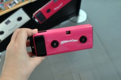 (株)タカラトミーは、5,980円(税込)の安価な3Dデジタルカメラ「3D Shot cam」を展示している。こちらは2011年2月発売予定。30万画素イメージセンサーを2個搭載し、2枚のJPEG画像を撮影。SDカードに保存した画像を印刷し専用のビューアーを通して見ることで、3D写真を楽しめるというものだ。裏面にはディスプレイを搭載しない。「安価かつ簡単に3D写真を楽しんでもらうことを目指した。専用ビューアーはメッセージカードとしても利用可能で、撮ったものを友人や家族にプレゼントすることもできる」(同社説明員)。