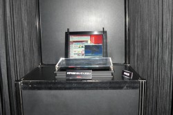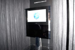 今回は、おサイフケータイ機能を搭載した携帯電話を使ったサービス例をデモしていた。ケータイをパネルに置くと、「FV-01」に表示されていた立体映像がケータイに吸い込まれる。ケータイにURLが表示され、そこにアクセスすると先ほど「FV-01」に映っていた映像が表示される、というものだ。