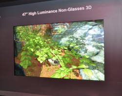 LG電子は84型、3,840×2,160画素のLEDバックライト搭載3D液晶ディスプレイを展示。バックライトは直下型。本機はアクティブシャッターメガネによる3D対応モデルだが、47型のメガネなし3D液晶ディスプレイも展示されている。本機は多視差変換LSIを搭載し、高精細な3D映像再生を実現しているという。