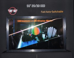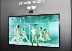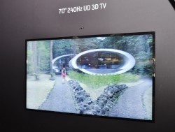 サムスンは酸化物半導体TFTを使った、70型のLEDバックライト搭載3D液晶ディスプレイ試作機を展示した。駆動周波数は240Hz、表示画素数は3,840×2,160画素(3D/2Dとも)となり、専用のアクティブシャッターメガネで3D視聴が行える。3D対応機は2D-3D変換機能を搭載するという。本機の隣には、同じ70型の2D対応モデルも展示されている。