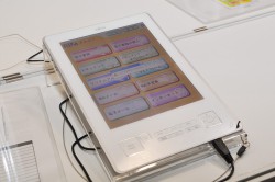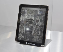 LGのブースにも“Triton”を搭載したeBookリーダーの試作機が置かれていた。サイズは9.7インチ、表示画素は800×600、色表示は4,096色対応。同社のブースでは白黒画面とカラー画面のコンボ表示対応eBookリーダー、折り曲げ可能なフレキシブル仕様のモノクロ電子ペーパーなども注目を集めていた。