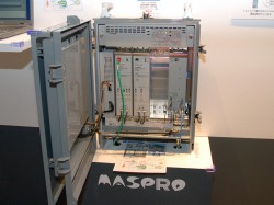 マスプロ電工は、地デジ放送の際の電波障害を軽減する装置「回り込みキャンセラー」を使用した地上デジタル放送用送信機など、業務用送信機器をメインに展示している。ワンセグ用の電波で映像を伝送するエリアワンセグなど、開発中のシステムを併せた精力的な展示を行っている。