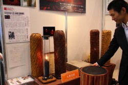 さらに、透明の軟質シートを円筒状にし、これを振動板に活用したスピーカー「TOMORI」も出展。内部には電球を備えており、シェードは竹細工。内部からの灯りが、シェードを通して拡散され、インテリアとしても活用できる製品になっている。