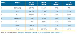 グローバルのブランド別シェアでは、サムスンが21.6%で1位。LG電子が13.5%で2位、ソニーが11.8%で3位に続く結果となった。また、4位は9.1%を獲得したパナソニックで、5位は8.0%を獲得したシャープ。上位4社は第2四半期からパーセンテージを落としたのに対し、両社はシェアを拡大させている。