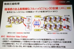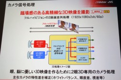 まずは3Dの映像/静止画撮影について。左右の独立したセンサーから入力された2つのフルHD映像を並列処理し、MPEG-4 AVCの拡張規格である3D対応フォーマット「MPEG-4 MVC」でリアルタイムエンコードすることが可能。これにより、解像度が落ちず鮮やかな3D映像を実現できるとのこと。また、L/Rの映像の特性差補正を行うこともできるという。