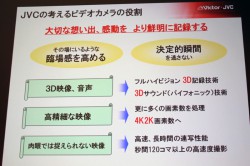今後はビクターの有する小型精密機器技術、高精細映像技術、再現性の高い音声技術、高効率符号化技術、高圧縮記録/再生技術などを進化させていくとのこと。これらの技術を活かし、YouTube掲載用動画を作るなど、簡便なコミュニケーションツールとして、はたまた3Dで臨場感溢れる映像を残すツールとしてなど、幅広い用途に合わせたカムコーダーを提供していく考えだという。伊藤社長は「今後もユーザー目線で多岐にわたる技術を進化させ、ユーザーのライブなコミュニケーションを支援したい」と締めくくった。