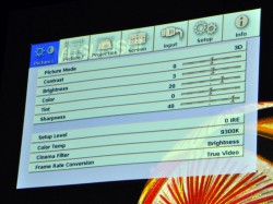 プリセットの映像メニューは「シネマ」「ビデオ」「ダイナミック」のほか、3D映像の表示に最適化した「3D」を設けている。RGBCMYを独立して「色彩」「彩度」「明度」で調整できるカラーマネージメント機能を備え、その他の項目も含めてユーザーが任意に調整した値を3つまで保存できる。なお3D再生時にはメニューから3D映像の明るさを「2.0〜5.5」まで0.5段階刻みで調整できるが、画面を明るく設定したぶんだけクロストークは発生しやすくなる。