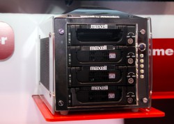 iVDR関連ではもう一つ、データアーカイブ用の「iVDR Storage Tower」も展示。4つのベイを備えており、iVDR-EXカートリッジだけでなく、3.5インチ/2.5インチのSATA-HDDやSSDなども混在して使用することができる。この機器も参考出展で、市販時期などは未定となっている。