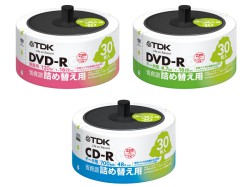 手持ちのスピンドルケースに詰め替えて使うDVD-R/CD-R。市販されているCDおよびDVDのスピンドルケースであればどれでも詰め替えられる。なお、いずれの製品も30枚入り。