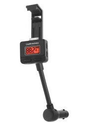 車内での使用を想定したiPodiPhone専用FMトランスミッター。新設計のスライドホルダーとバックレストでiPod/iPhoneをしっかり固定。フレキシブルアームを好みの位置に合わせることで、操作しやすい場所に配置できる。