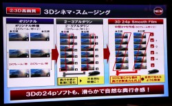 さらに24コマ×2chの3D映画ソフトの場合、中間フレームを生成して60コマ×2chの映像を表示する「3Dシネマスムーサー」も備える。これまでは2-3プルダウンで60コマに変換して表示していたが、この場合、奥行き感が急激に変化することがあり、不自然な映像になることもあった。中間フレームを生成する方法の場合、滑らかな動きと奥行きの自然な変化を両立させることができるという。