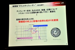 振動板前面に配置するサウンドディフューザーも新たに開発。特許技術を出願しているというパーツには、試作と試聴を繰り返しながら形状・大きさ・数量・位置を最適化した孔をディフューザーとして設け、高域の音圧向上と広がり感、伸びを高めるとともに、解像感が豊かで自然な音の広がりを実現したという。