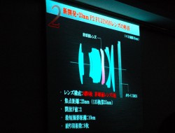 レンズには、新開発のフジノン23mm F2レンズを搭載。6群8枚構成で、非球面レンズが1枚用いられている。レンズの交換はできない固定式で、非沈胴の単焦点レンズとなる。本機に合わせて新規に開発したもので、薄型/小型化と高画質の両立を実現したという。