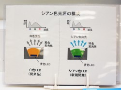 今回展示された試作機には、昨年に発表された、レーザー光源を用いた3D対応のDLPリアプロジェクションテレビ“LASERVUE”「75-LT1」の開発により培ったレーザー技術を投入。人の目の識別能力が高い色でありながら、これまで白色LEDでは再現が鈍かった「赤色」の光源にのみ赤色レーザーバックライトを採用している。残る青色と緑色については、青色LEDに緑色の蛍光体を組み合わせて発光させるシアン色LEDを光源とし、高品位かつ高効率な映像再現を可能にした。