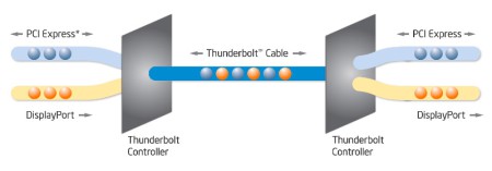 PCI ExpressでRAIDアレイのような外部高性能周辺機器に直接接続したり、FireWire、USB機器、まはたギガビットEthernetネットワークなどへも、別途アダプタを介してThunderboltポートに接続することが可能になる。