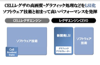 「レグザエンジン CEVO」には新LSIと専用チップを組み合わせた新しいアーキテクチャーが採用されている。LSIにはグラフィックアクセラレーターを搭載。従来の「CELLレグザエンジン」ではCell Boradband Engineとソフトウェアのパフォーマンスにより実現していた高度な処理を、CEVOではハードウェアベースの処理に分散させたことで、ソフトウェア技術による処理負担を軽減し、エンジン全体としての処理効率を高めている。