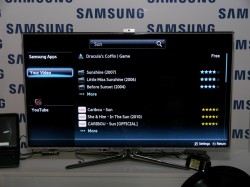 スマートTVのデモンストレーションでは、テレビ専用アプリをベースに快適な操作性を提供するプラットフォーム「SMART HUB」が、フラグシップ液晶テレビ「9000シリーズ」を使って紹介された。本機はDLNAに対応しており、同社製のBDレコーダーやWiFi対応カメラ、スマートフォンやタブレット端末と連携させることができる。デモではSMART HUBの特徴である検索UI「All Share」も紹介され、テレビに接続したBDレコーダーや外付USB-HDDなどに保存されたコンテンツをはじめ、インターネットからキーワード検索でヒットしたYouTube動画、Facebookの関連ページなどを一覧表示し、様々な関連情報にアクセスできることをアピールした。