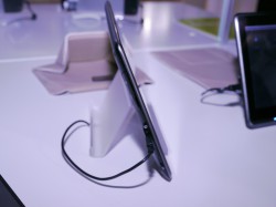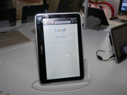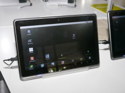 今回のイベントで注目を集めていたのが、HANNSpreeブランドのタブレット端末「HANNSpad SN10T1」だ。Android OS 2.2を採用しており、10.1型、1,024×600画素の液晶パネルはマルチタッチ操作に対応している。ARMの1GHzデュアルコアCortex A9プロセッサー、NVIDIAのTegra IIグラフィックスエンジンをそれぞれ搭載。1080p動画のスムーズな再生が楽しめるという。本体には16GBの内蔵メモリーを備えるほか、SDメモリーカードスロットやHDMI端子も搭載する。ヨーロッパでは3月から発売されており、価格は379ユーロ。会場には本機の開発ノウハウを活かして、さらに薄型化を図ったタブレット端末のプロトタイプモデルも出展されていた。