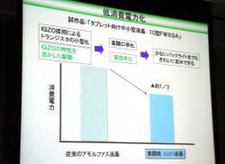 同社ではこの技術を使って、タブレット向けの、解像度1,366×768の10型液晶パネルを試作。従来のアモルファス液晶に比べて3分の1程度、消費電力を抑えることができたという。