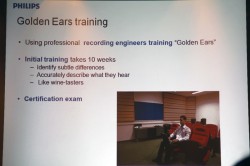 フィリップスのオーディオ製品は、同社の「Golden Ears」と呼ばれるサウンドエキスパートがチューニングを施しているという。この「Golden Ears」の認定試験は、微妙な音の差を聞き分けたり、音の違いを言葉で説明するなどといった約10週間の訓練を経たのちに行われるもの。昨年8月に行われた際は、200人が訓練を受けたが8人しか合格しなかったほど厳しいものであるという。今回発表された新製品はもちろん、2011年夏以降に発売される同社製品はすべて、この「Golden Ears」によるチューニングが施されたものとなる。