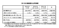 3D対応BDレコーダー/プレーヤーは55万1千台で、BDレコーダー/プレーヤー全体における構成比は45.0%。3Dパソコンは1万6千台で、パソコン全体における構成比は0.6%となった。
