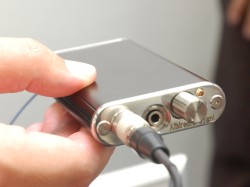 バイオスケールのブースでは、6月中旬〜下旬発売予定のポータブルヘッドホンアンプ“Bispa”「BSP-PHPA-03R」の実機が公開された。価格は25,000円前後となる見込み。