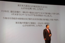 まず登壇した山田社長は、3月11日に発生した東日本大震災に関するNTTドコモの取り組みを発表。福島原発30km圏内のエリアを除く東北3県にある307の基地局のうち、290局がすでに復旧。残り17局も5月中に復帰する予定だという。また、福島原発30km圏内にある68基地局も、51局が復旧を完了しているとのことだ。