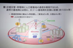 まず通常の基地局とは別に、大ゾーン基地局を全国約100箇所に設置。1基で広範囲をカバーできるもので、広域災害・停電時に人口密集地の通信を確保することをねらう。次に都道府県庁や市区町村役場などの通信を確保するため、約1,900の基地局で無停電化、バッテリーの24時間化を推進する。