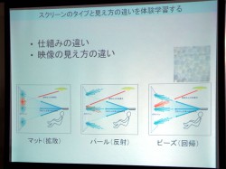 なお、講師にはファイル・ウェブなどでも活躍する評論家の鴻池賢三氏らも参加。「なるべく実機を触りながらの講座を行っている。例えばスクリーンのタイプにはマット、パール、ビーズなど色々あるが、実際に見てみないとよく分からない部分もある。それを講座で実際の製品を体験することで、販売店の店員であれば実感を持ってお客様などに説明できるようになってもらおうというものだ」と講座の特徴を解説する。
