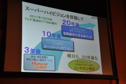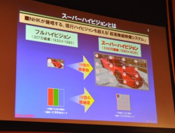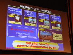 ディスプレイ機器については、「これまでは投写型のプロジェクターしかなかったが、今回世界最高のディスプレイ技術を持つシャープとの共同開発により、初めて直視型ディスプレイの開発に成功した。NHKではSHVの研究開発を始めたときから、高精細な映像を家庭で楽しんでいただくことが一つの大きな目標としてあったので、家庭用をターゲットとした今回の開発成果を大きな意味を持っていると考えている。今後は視聴者に、よりリアリティのある映像をお届けできるよう、開発研究さらに加速させていきたい」と意気込みを語った。
