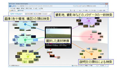 今回、映像の色や模様、構図などの“映像の類似性”から検索する手法と、メタデータに含まれる“文の類似性”から検索する手法を組み合わせた「EN-Vision」を開発。選択した素材映像と映像(色や模様、構図)の類似性や、撮影対象の説明文の類似性などを元に自動検索し、選択した映像の周囲に関連づけて検索結果を表示する仕組みとなる。