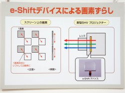 同製品では、画像シフト切り替え電気信号により光の屈折率が変化する「e-Shiftデバイス」と、800万画素の表示素子をRGB各1枚の計3枚使用。RGBの3原色すべてにおいて画素ずらしを行うことでフル解像度並みの画質を実現したという。また、本機はすでに発売されている4Kプロジェクターに機能を追加したもので、低コストである点も特徴としている。