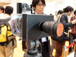1枚の撮像素子でカラー画像を取得する「単板カラー撮像方式」によるコンパクトなスーパーハイビジョンカメラの試作機も展示。今回は、カラーフィルターを搭載した3300万画素撮像素子を用いて小型撮像実験装置を試作し、スーパーハイビジョン映像の撮像実験を行っている。