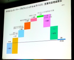東日本大震災の影響については、売上高で約4,400億円、営業利益で約1,500億円が減少する影響があると予測。加藤CFOは「2011年度の震災による影響はかなり大きいと現時点では見ている。その結果、売上げは前年比増収を見込むが、営業利益は横這いになりそうだ。2012年度の目標に掲げている5%の営業利益達成に向けては厳しいが、震災は既に起きたことであり、現在の状況の中で努力していく」と述べた。
