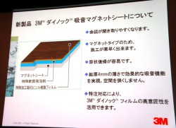 青柳氏はグローバルの3Mグループの概要や、3Mジャパングループの歴史からひもとき、2010年に50周年を迎えた歴史ある企業であることを説明。ダイノックシリーズについては「約40年以上の歴史がある製品。0.2mmのフィルムを貼るかんたんな施行だけで、様々な意匠を実現できる」とその魅力をアピールし、今回の吸音マグネットシートにも、ダイノックシリーズの高いデザイン性が活かされていると説明した。