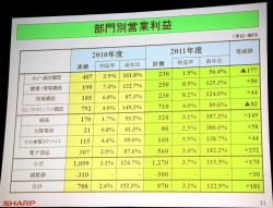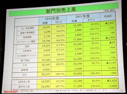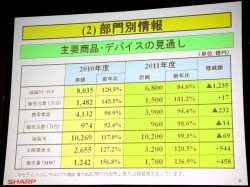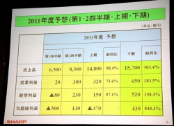 なお同社は2011年度に特別損失として、亀山第2工場の液晶事業構造改革費用に150億円を、また震災に関連して工場の操業を止めていた損失として270億円を計上する予定。この影響で、純利益は前年比30.9%の60億円にとどまると予想している。