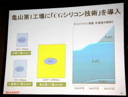 実際のパネル生産についても、片山氏はくわしく説明した。CGシリコン液晶については「天理工場で生産を再開しており、三重第3工場も増産を検討しているが、これだけでは生産性を上げきれない」と、亀山第1工場にCGシリコン生産設備を導入する計画を改めて説明した。