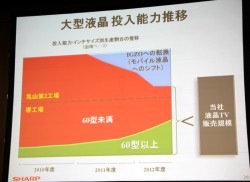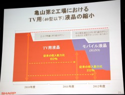 テレビ向け液晶パネルについては「成長市場は大画面にある」と片山氏は繰り返し強調。亀山第2工場における40型以下のテレビ用液晶パネルの生産を段階的にIGZOへ転換し、2010年度前半は100%だったテレビ向けの比率を、2012年度の早い段階で20%程度にまで落とす計画を発表した。これに伴いテレビメーカーへのパネル販売も縮小させる。