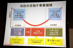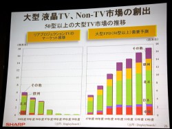 さらに片山氏はテレビ向けパネルについて、20〜40型クラスの中小型液晶テレビから60型超の大型液晶テレビやデジタルサイネージなどのノンTV向けなど、大型化へのシフトを行う計画も表明。「モバイル用液晶や大型テレビ用/ノンTV用の大型パネルに当社のオンリーワン技術を投入。成長性の低い、コモディティー化した液晶分野から脱却を図る」とし、20〜40型クラスの液晶パネル生産を段階的に縮小する考えを示した。