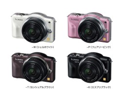 本体色は、ボディ単体およびパンケーキレンズ付属の「DMC-GF3C」がエスプリブラックのみでの展開。ダブルレンズキットの「DMC-GF3W」のみ、それに加えてシェルホワイトとセンシュアルブラウン、フェアリーピンクという計4色のカラーバリエーションも用意している。