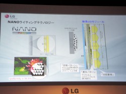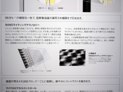 「NANO FULL LED」は、極薄LEDバックライトモジュールに遮光パターンフィルムと拡散板を組み合わせたもの。遮光パターンフィルムに5,000個以上の「NANO粒子」による反射孔を用い、光が遠ざかるほど強く反射するよう調整することで輝度の均一性を高めたほか、より細かいエリア駆動でバックライト制御を行えるようにした。エリア駆動は55V型が288分割(24×12)で、47V型が240分割(24×10)。ダイナミックコントラストは1,000万対1。