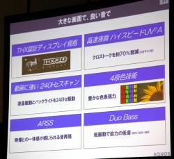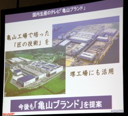 なお中村氏は、亀山ブランドのAQUOSが今後も継続することも強調。中村氏は先日亀山工場の生産を中小型液晶にシフトするという発表を同社が行ったことに触れ、「一部で亀山ブランドのテレビはなくなるのか、という誤解を与えてしまったが、亀山工場でのテレビの生産をやめるわけではない。あくまでテレビ向けと中小型液晶、両方をフレキシブルに展開するということだ」とした。