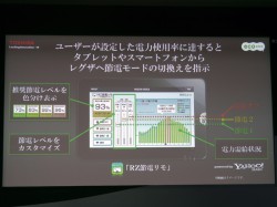 三つめは、節電を支援するAndroidアプリ「RZ節電リモ」だ。これはYahoo! JAPANが提供する「電力使用状況メーター」を活用し、電力の使用状況に応じて、タブレットやスマートフォンでレグザの節電モードを自動調節できるというもの。節電レベルをユーザーがカスタマイズし、設定したレベルに達した場合は内蔵バッテリーでの駆動を促すアラートが出る。