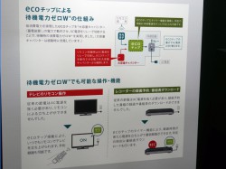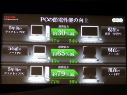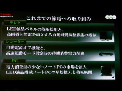 テレビではLED液晶パネルの採用を押し進め、高画質と節電を両立する自動画質調整機能を開発。レコーダーでは自動電源オフ機能の搭載や、高速起動モード設定時の待機消費電力削減に取り組んでいる。またPCではLED液晶搭載ノートPCを積極的に展開している実績を持つ。これらの取り組みにより、5〜6年前のモデルと比べ、現行ラインナップでは消費電力の大幅削減に成功したとのこと。