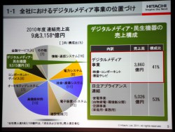 渡邊氏はまず、日立全社におけるデジタルメディア事業の位置づけについて説明。2010年度の売上高は3,860億円で、このうち薄型テレビ事業が29%の売上を占め、残りが液晶プロジェクターや光ストレージ、光ピックアップなどの映像・コンポーネント事業だった。今後は映像・コンポーネント事業を伸ばす戦略を明確にし、2011年度は売上構成比を80%、2012年度には83%に高める。
