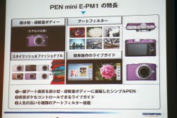 上記のPEN LiteとPEN miniの位置付けは、「Liteはこれまでエントリー向けモデルとして訴求してきたが、今後は高機能を小型ボディに収めたモデルとしてアピールする。miniは、基本撮影機能は上位機から踏襲した超小型ボディのエントリーモデルという位置付け」とのことだ。