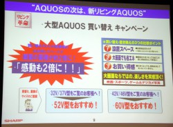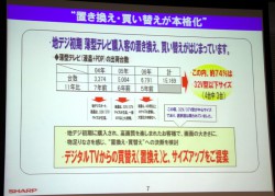 山田氏はまた「7月24日以降の薄型テレビ市場は、デジタルからデジタルへの買い替えへの市場へと完全に移行する。こういった中でシャープとしては、買い替え・置き換え需要への提案を強化していく」と説明した。