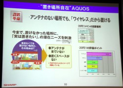 設置ではもう一つ、Wi-Fiを活用した“フリースタイルAQUOS”の提案にも力を入れる。同社が販売を始めた「20FE1」のユーザーアンケートでは「実際に8割のお客様が、アンテナの無い部屋に設置されている」とし、「こういった提案をもっと大きなサイズでも行っていきたい」と、今後ラインナップをさらに充実させる考えを示した。